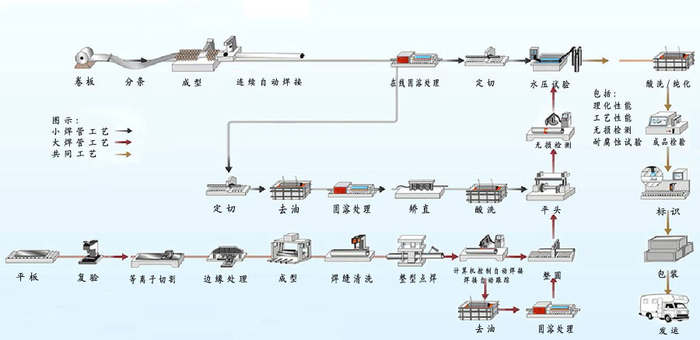 公司擁有國內(nèi)先進制管流水線6條。從分條開卷、清洗脫脂、緄軋成型、焊接、打磨、定徑、在線固熔、渦流探傷、標志噴碼、定尺檢驗、氣密性試驗、檢驗包裝,都嚴格按照GB/T12771-2000《流體輸送用不銹鋼焊接鋼管》、ASTM A249/A249M-96a《鍋爐、過熱器、熱交換器及冷凝器用奧氏體焊接鋼管》、SA-249/SA-249M《鍋爐、過熱器、換熱器和冷凝器用焊接奧氏體鋼管子》執(zhí)行。公司專業(yè)生產(chǎn)的管徑12mm-76mm,壁厚0.2mm-3.0mm的不銹鋼氬弧焊管,廣泛用于電力、化工、機械等行業(yè);特別對電力行業(yè)的凝汽器改造用的高效不銹鋼管的生產(chǎn)、安裝有著豐富的經(jīng)驗和能力。